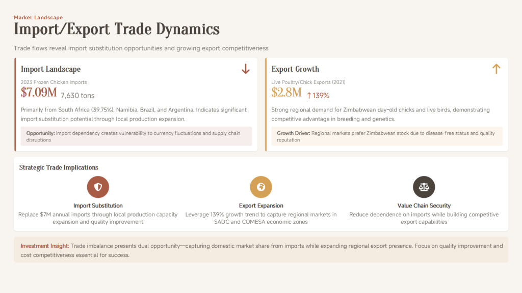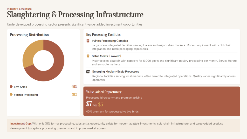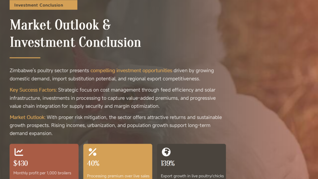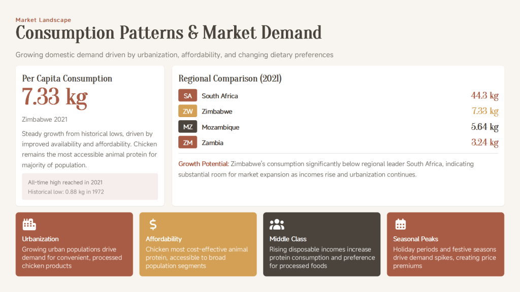 | Market Position | Poultry is the most consumed meat in Zimbabwe, but domestic production is often constrained by high input costs (especially feed). |