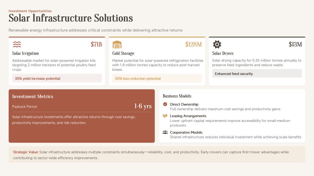 | Investment Entry Points | 1. Feed solutions: Investing in drought-tolerant feed crop cultivation or alternative protein feed ingredient production is a strategic move to control the industry’s lifeline. 2. Modern farming facilities: Building environmentally controlled poultry houses to enhance biosecurity and farming efficiency. 3. Efficient slaughtering/processing plants: Investing in highly automated, hygienic standard-compliant processing plants capable of value-added cutting to serve regional markets. |