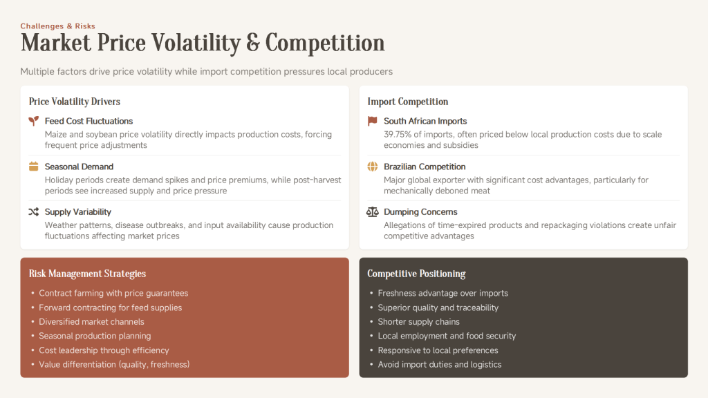 | Economic Risks | High and volatile input costs (especially feed); high local financing costs; volatile forex policies. Mitigation: Seek cooperation with ZIDA to attract international investment; explore vertical integration to control costs; use tools like futures to hedge price risks. |
