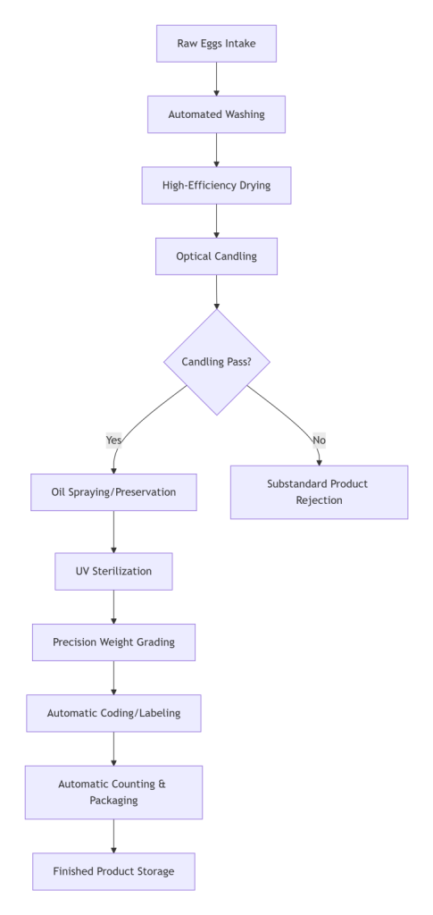 3. وحدة الحفظ والتعقيموحدة رش الزيت والتعقيم بالأشعة فوق البنفسجيةرش زيت معدني صالح للأطعمة لتكوين طبقة حماية؛ نفق أشعة فوق البنفسجية للتعقيم الثانوي للسطح.يُطيل عمر التخزين بشكل كبير، ويعزز معايير النظافة والسلامة، ويلبي متطلبات “البيض النظيف”.