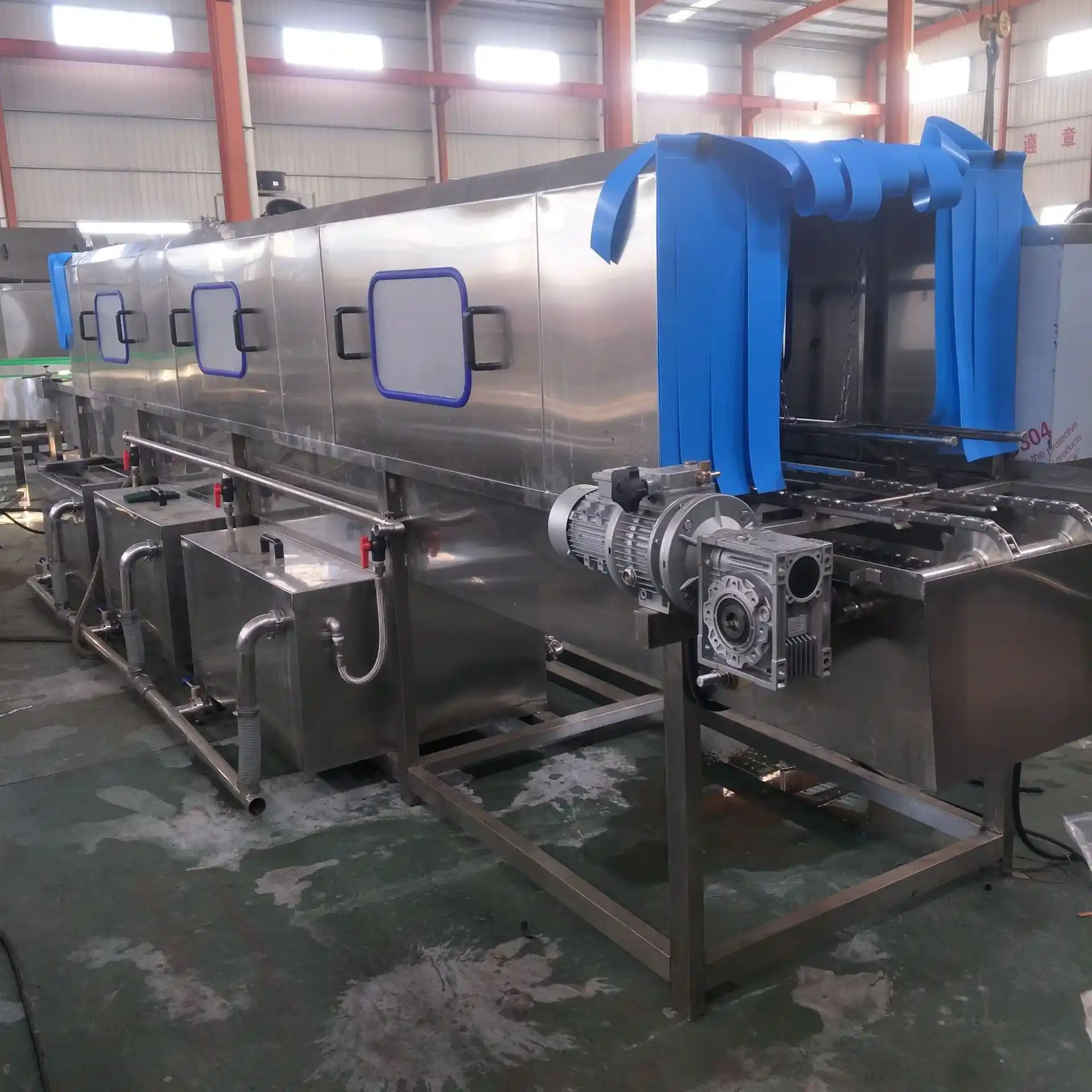 Conveying System: Chain or mesh belt conveyor with adjustable speed, ensuring smooth container passage through each section.