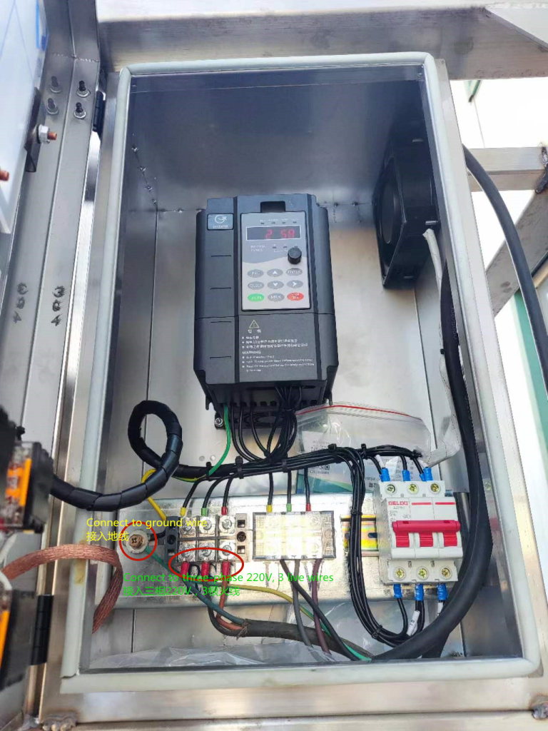 Abra el cuadro de control de alimentación y verifique todas las conexiones al convertidor de frecuencia. Encienda la alimentación principal solo después de la confirmación.