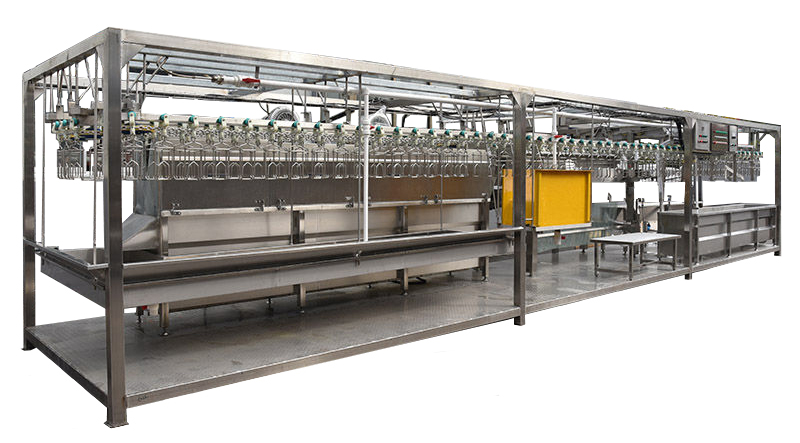 La línea compacta de sacrificio de pollos es una línea de procesamiento de pequeño formato, diseñada para una capacidad de 300 a 800 pollos de engorde por hora. Se caracteriza por su fácil instalación, estructura compacta y alta relación costo-eficiencia. Fabricada en acero inoxidable, integra todo el proceso desde el colgado y aturdimiento hasta el escaldado, desplumado, eviscerado y precooling de las canales. Gracias a su funcionalidad completa, es la opción ideal para operaciones de sacrificio de lotes pequeños.