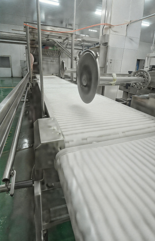 The conveyor belt with a circular saw is a core piece of equipment in pig, cattle, and sheep slaughtering and processing lines, located after carcass cooling and aging but before fine cutting and packaging.