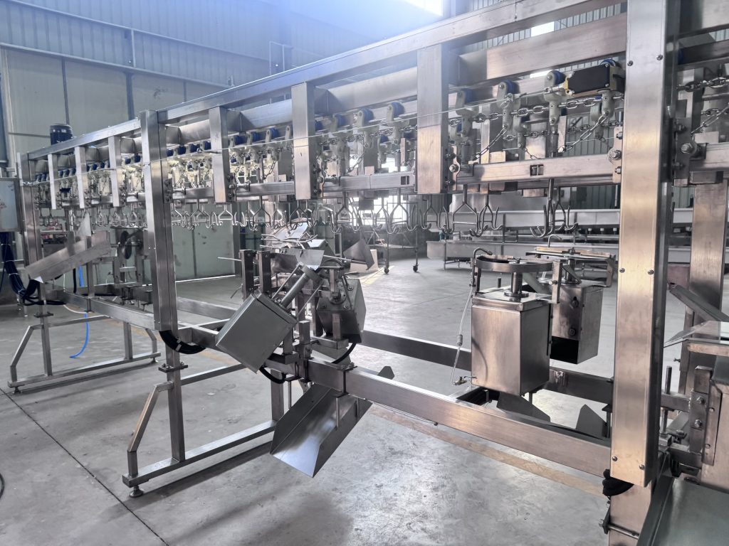 A mechanical push-rod detaching mechanism is installed at the process end. When only the drumsticks remain hanging on the hook and reach the designated position, they engage with the push-rod mechanism, causing the drumsticks to detach smoothly. This process achieves lossless detachment, avoiding product impact or deformation and ensuring the drumsticks remain intact. The detached drumsticks are centrally collected via a chute, completing the final step of automation, greatly reducing manual intervention and enhancing overall line automation.