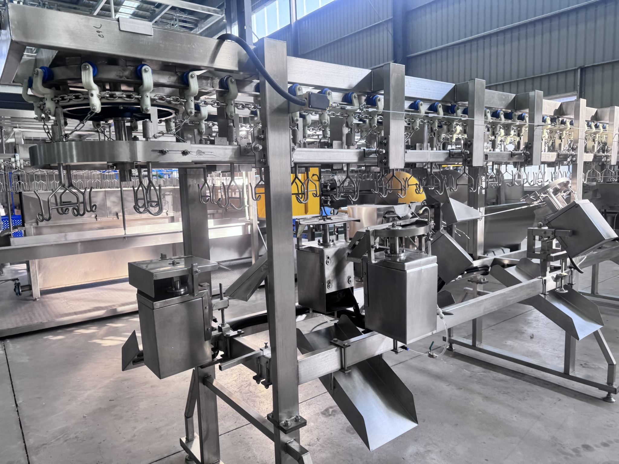This station is equipped with symmetric, adjustable dual-side rotating disc blade assemblies. Blade height, spacing, and cutting angle can be finely tuned according to carcass size to adapt to different product specifications. As the carcass passes through, high-precision guide rods automatically guide the left and right wings into preset cutting zones. The disc blades on both sides, driven by independent motors, synchronously and rapidly cut into the shoulder joint connections, achieving complete and precise separation of the left and right whole wings. Cutting depth is program-controlled to ensure only joint tissues are severed without damaging adjacent breast meat. The separated whole wings fall by gravity via dedicated guide chutes into collection bins below for sorted collection.