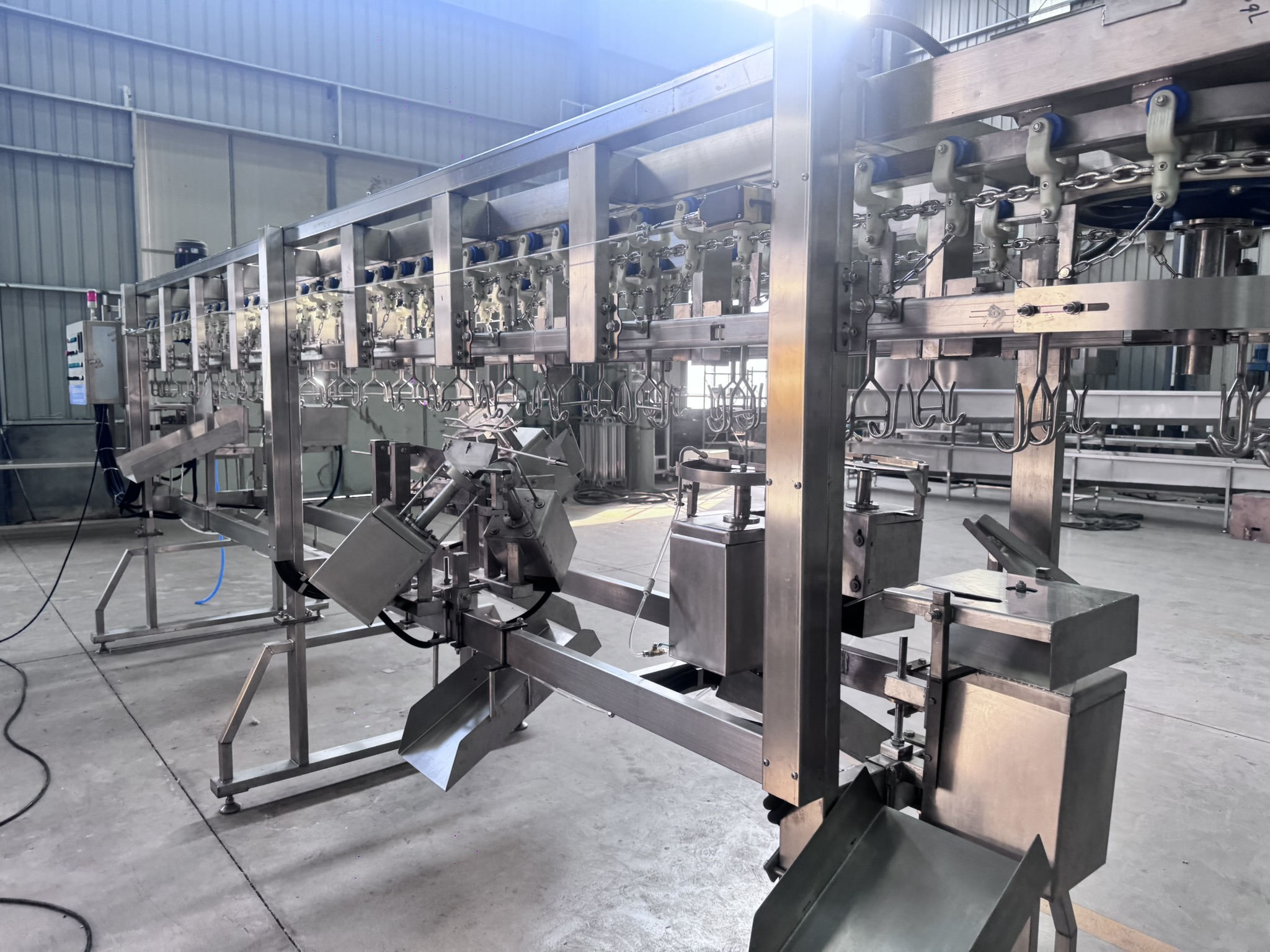 A mechanical push-rod detaching mechanism is installed at the process end. When only the drumsticks remain hanging on the hook and reach the designated position, they engage with the push-rod mechanism, causing the drumsticks to detach smoothly. This process achieves lossless detachment, avoiding product impact or deformation and ensuring the drumsticks remain intact. The detached drumsticks are centrally collected via a chute, completing the final step of automation, greatly reducing manual intervention and enhancing overall line automation.