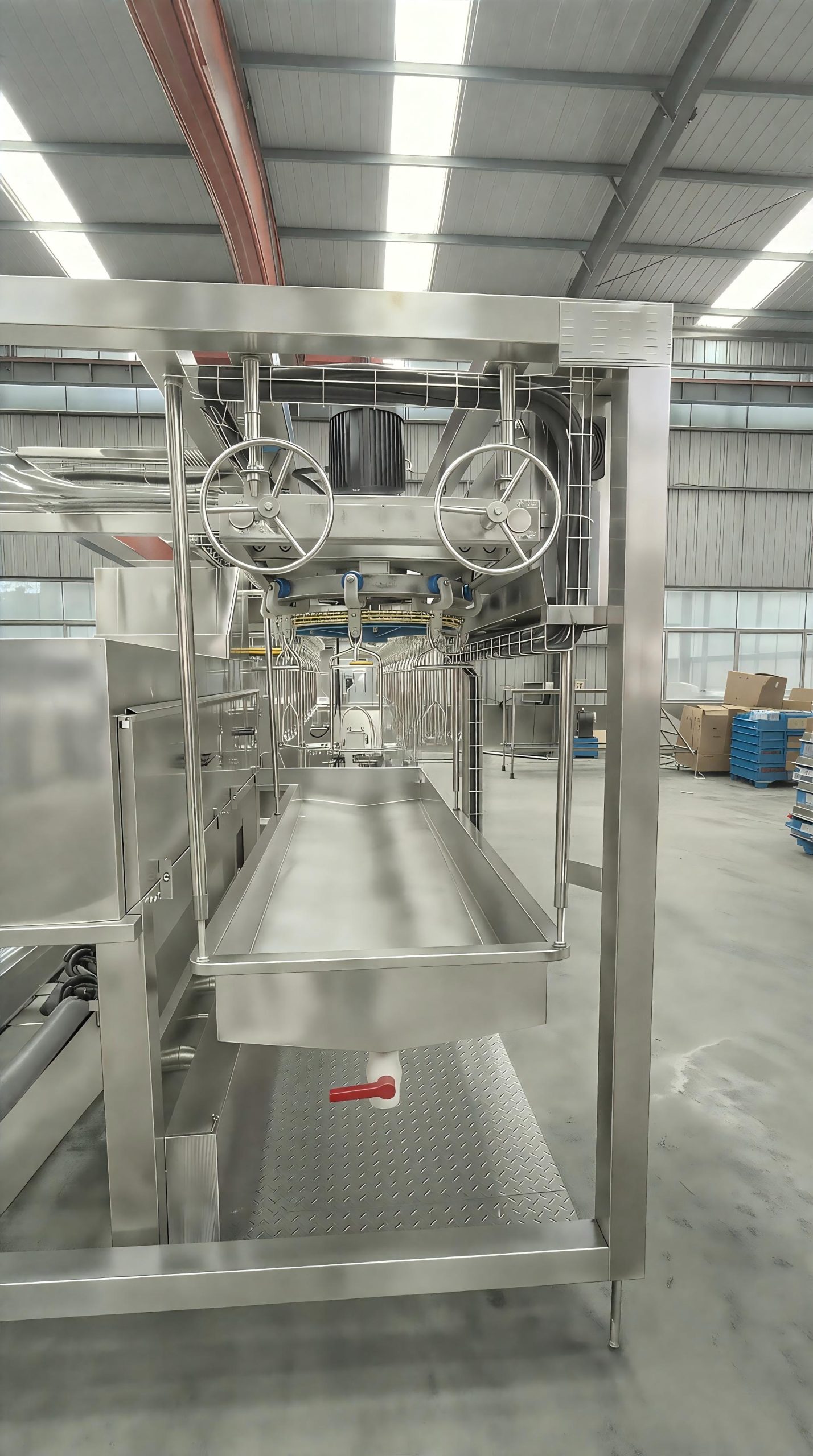 Stainless steel conveyor for hygienic, humane livestock exsanguination, ensuring food safety and quality.