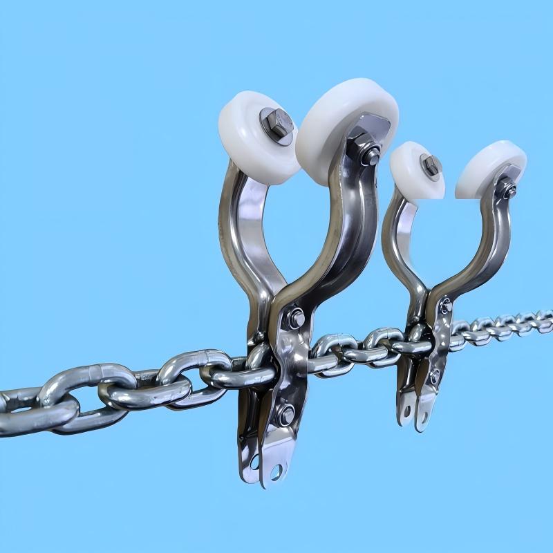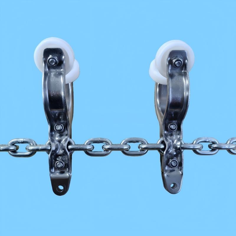 A core metal moving component designed for heavy-load, high-intensity poultry slaughter conveyor lines. This product is a metal pipe-rail conveyance carriage (also known as a heavy-duty trolley), manufactured from metal materials. It operates on round or square pipe rails, linked in series by galvanized drive chains, providing a robust and reliable carrier solution for high-capacity, continuous-production slaughter lines.