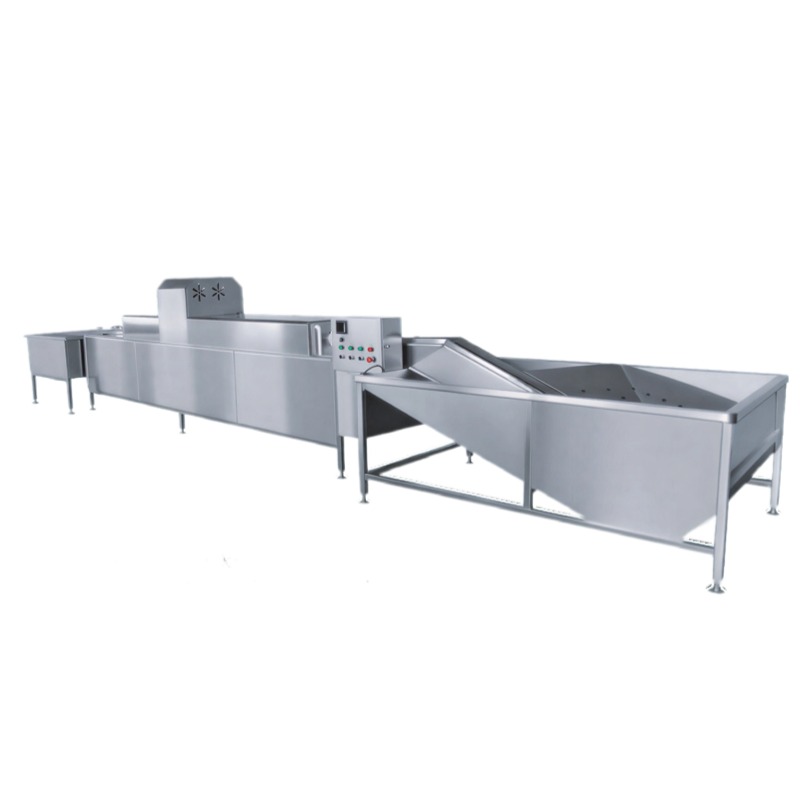 This line is the critical first step in value-added egg processing. It begins with gentle loading, often via a central hopper and lane dividers. Eggs then pass through rotating soft-brush modules that scrub away attached dirt and bloom, followed by a spray tunnel using tempered, sanitized water for a final rinse. The culmination is a high-velocity air-knife drying section that leaves eggs completely dry, preventing bacterial growth and preparing them for downstream grading or oiling.