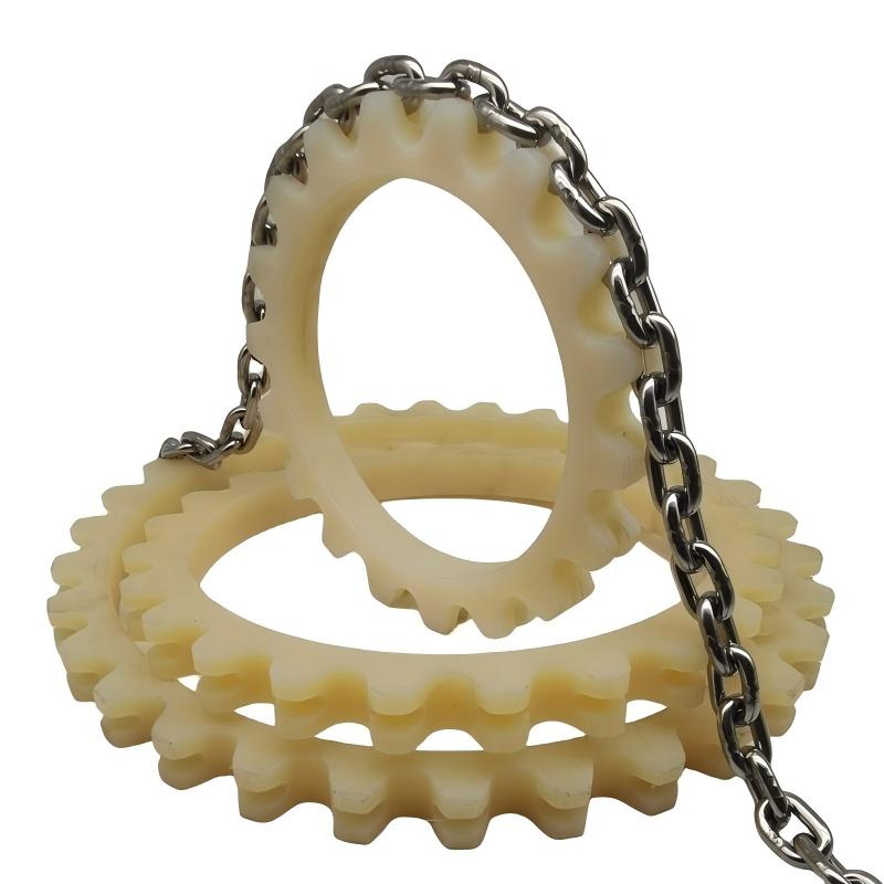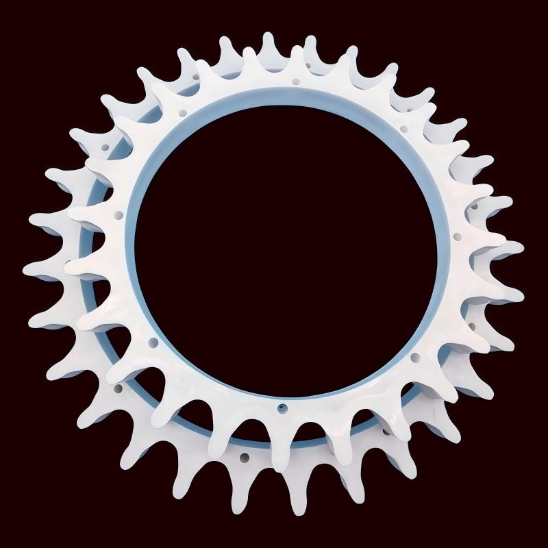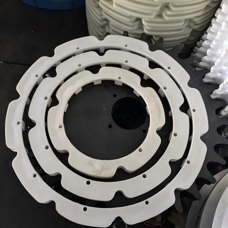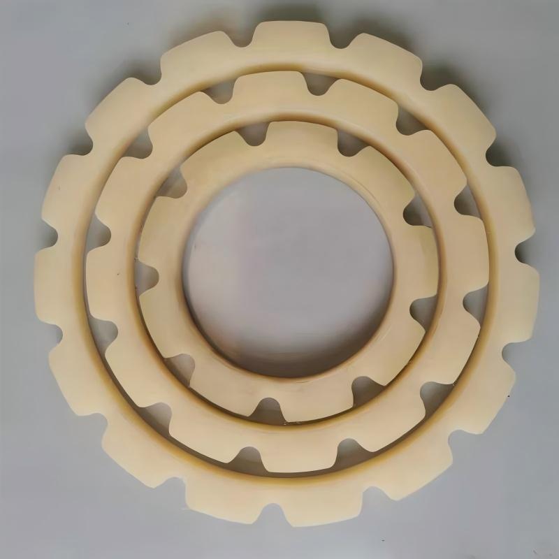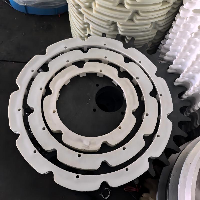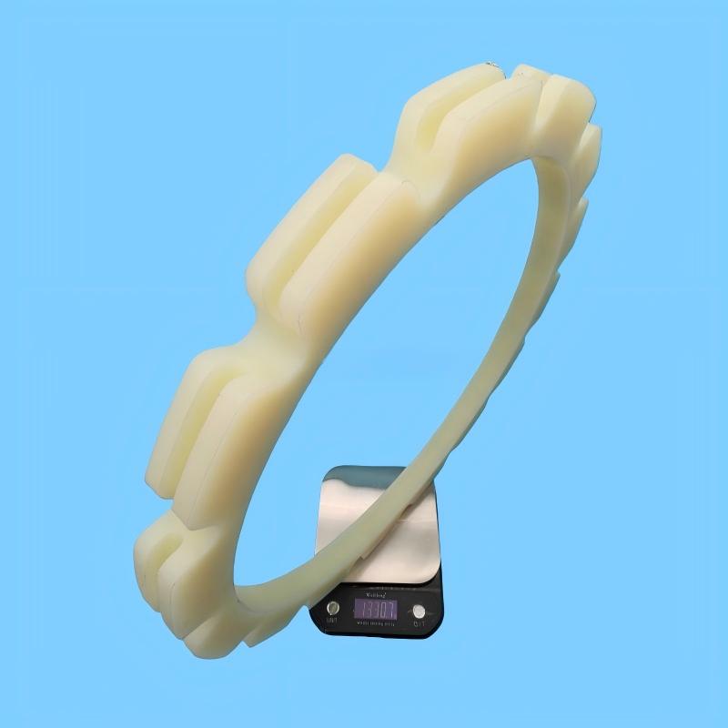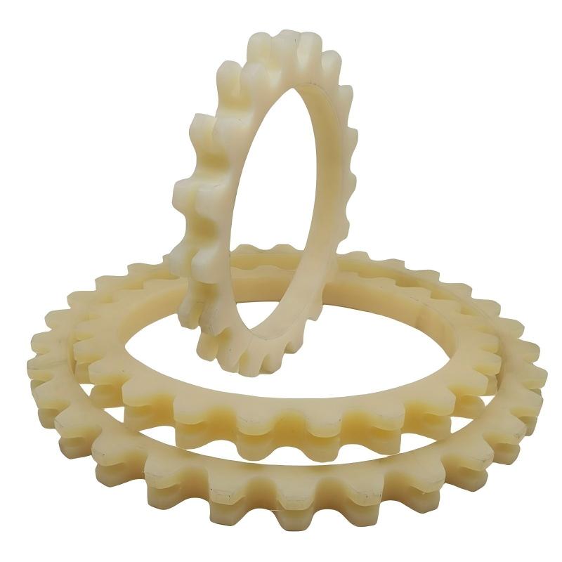 A nylon gear ring component designed for rotary guide wheels in poultry slaughter overhead lines. It can be quickly installed on the outside of existing metal guide wheels to upgrade them into drive wheels, enabling smooth turning and power transmission.