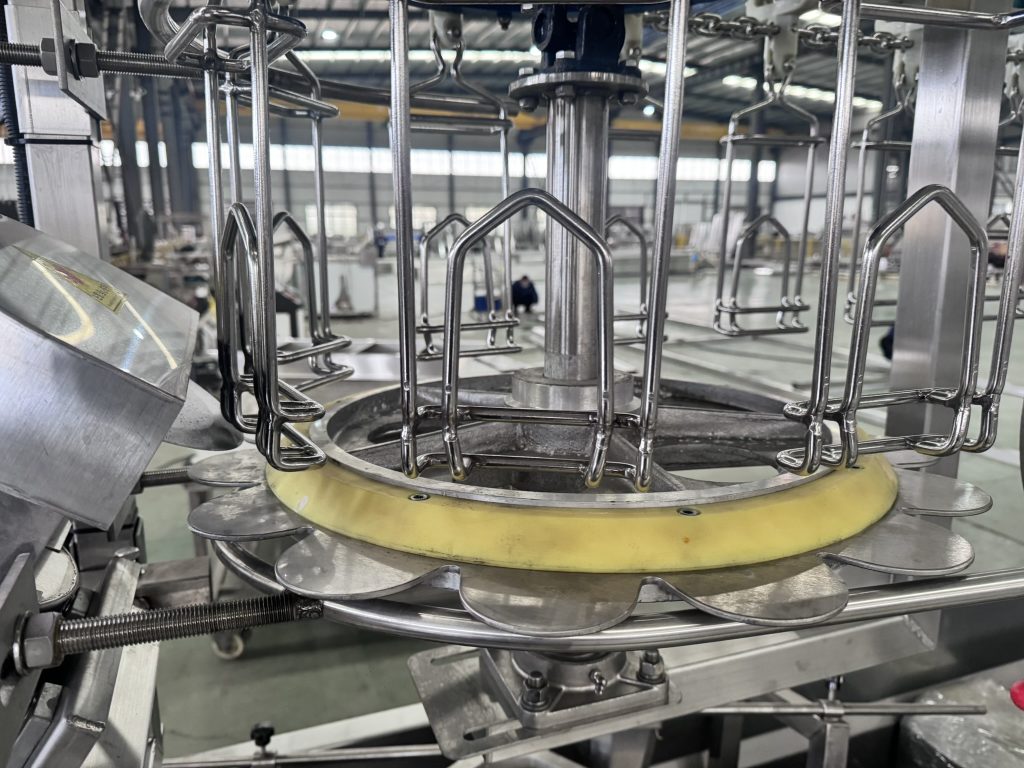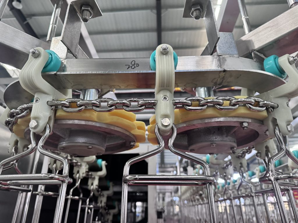 - Подвесная конвейерная линия: Является основным транспортирующим узлом, выполнена из нержавеющей стали (цепи и направляющие). Шаг крюков — 8 дюймов, общее количество — 200 штук. Оснащена приводным мотором (диаметр 485 мм, мощность 1.5 кВт), частотным преобразователем, натяжным устройством и направляющими роликами для обеспечения плавной работы.