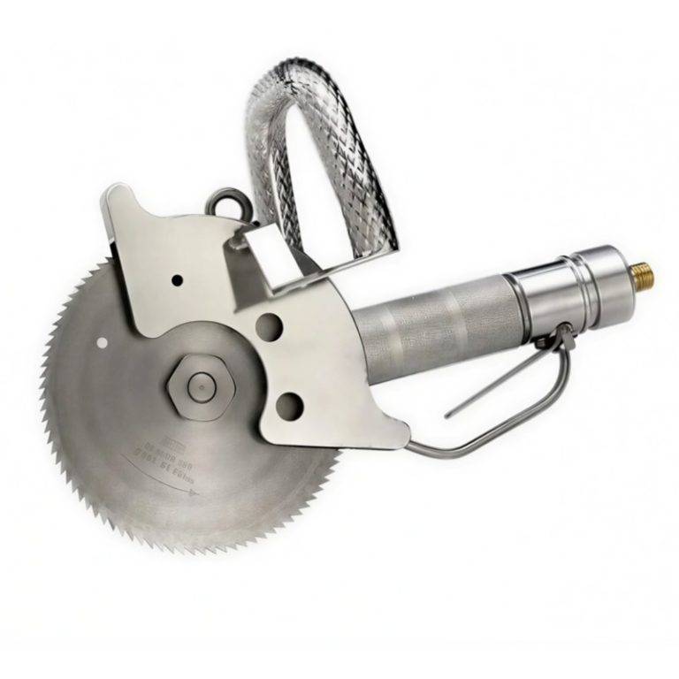 Ручная пила для грудинки NPW — это специализированный мощный инструмент, созданный для критически важного этапа торакотомии на линиях переработки говядины. Сконструированная для контроля и точности оператора, она обеспечивает эффективное вскрытие грудной полости КРС. Разработанная для использования совместно с балансиром инструмента (для снижения усталости оператора) и специализированным устройством для санитарной обработки пил (для обеспечения гигиены между использованиями), эта система представляет собой надежное, эргономичное и гигиеничное решение для скотобоен среднего и крупного масштаба.