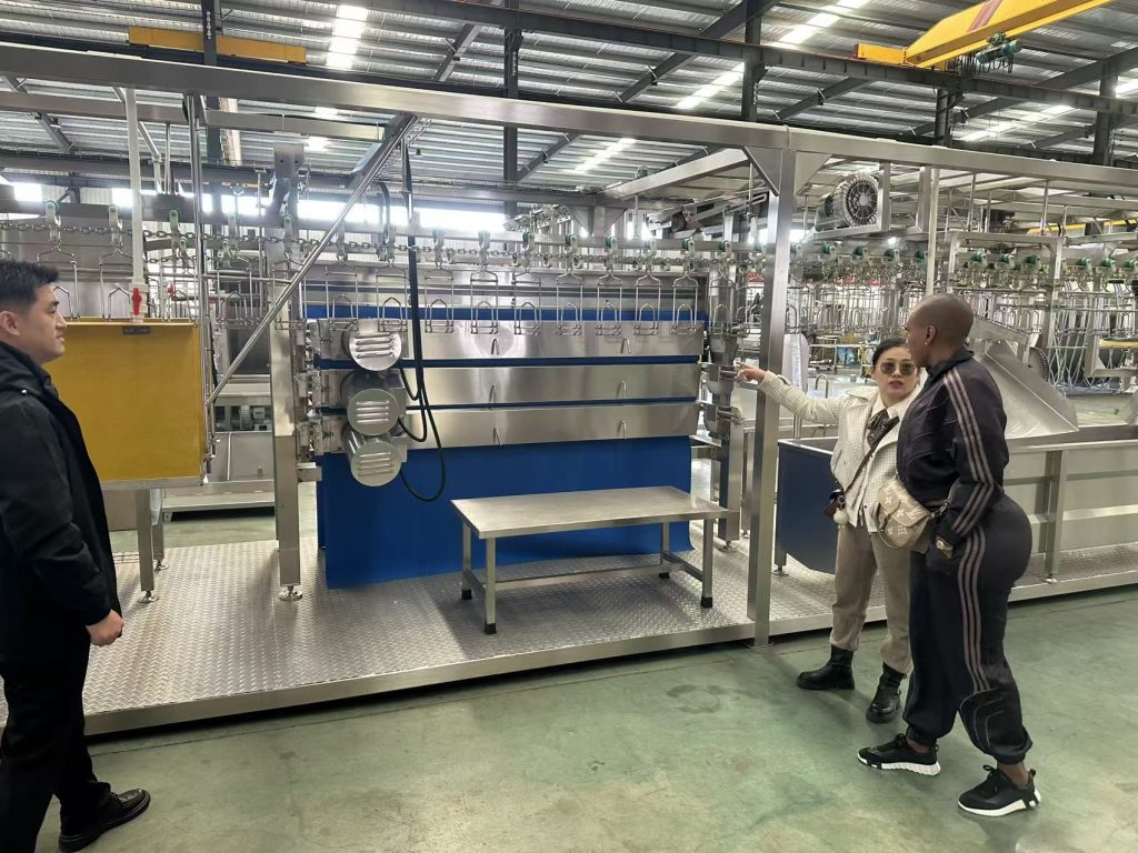 Podczas wizyty klient udał się głęboko do hali produkcyjnej, szczegółowo obserwował stan działania podobnych kompaktowych linii do uboju oraz przeprowadził dogłębne wymiany z naszym zespołem technicznym na interesujące go tematy, w tym wydajność produkcji, trwałość urządzeń,